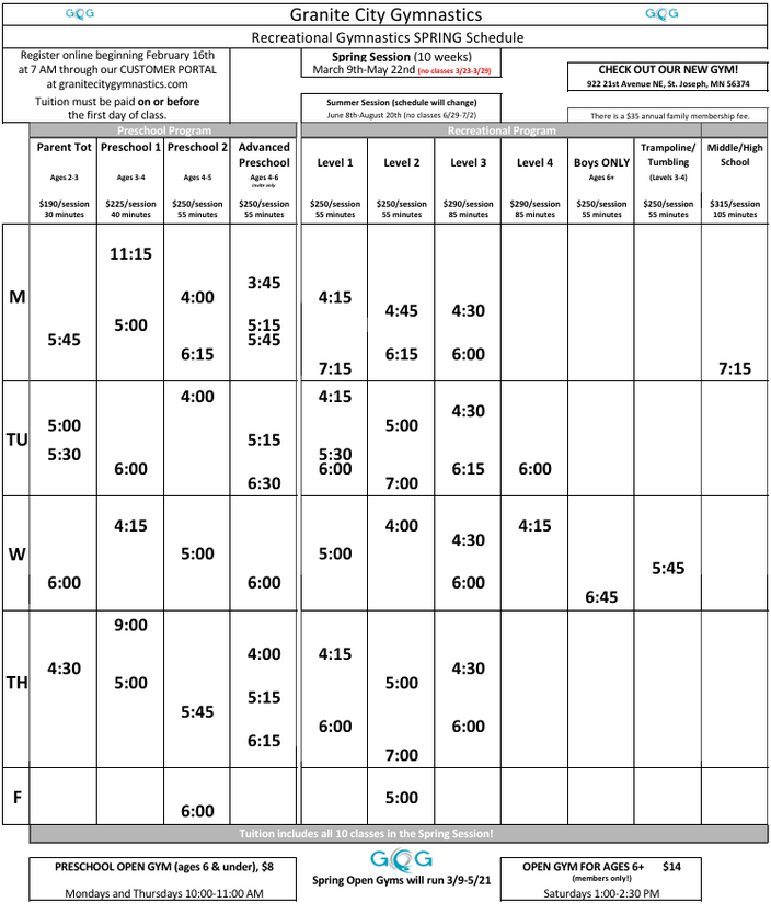 Recreational Gymnastics Schedule